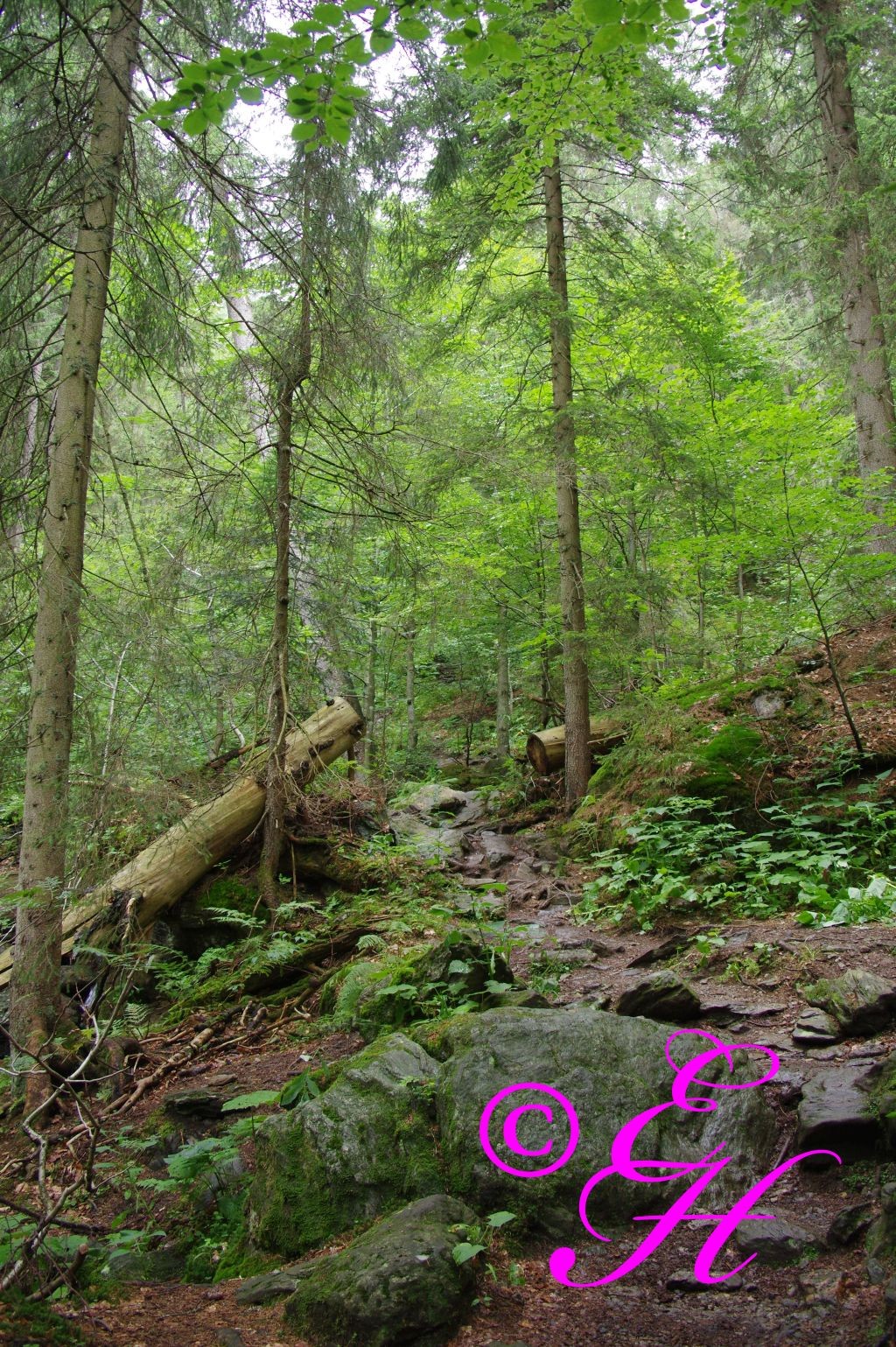 Bald allerdings verlassen wir den Waldweg und begeben uns auf einen steinigen Pfad, der neben dem Großen Höllbach entlang führt. Hier sieht es schon wieder richtig urwaldig aus. Umgestürzte Bäume und im Weg liegende Felsbrocken müssen überwunden werden. Als Vorgeschmack auf den Höllbach-Wasserfall sehen wir einen kleinen Wasserfall, der über einen Felsbrock rauscht.