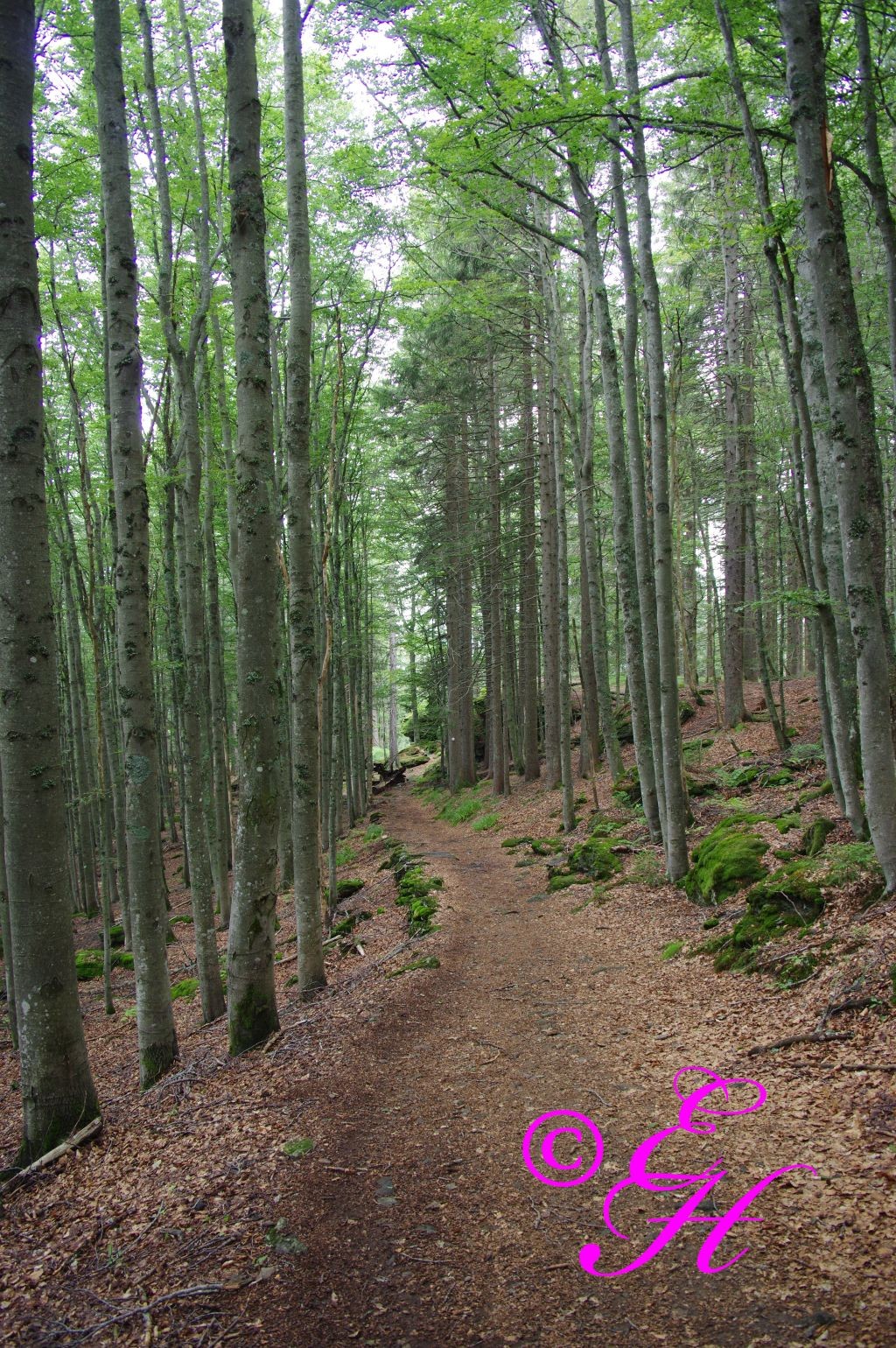 Dann geht es schon wieder bergab in Richtung Weiße Brücke. Komischerweise ist auf dem Gipfel kein Wegweiser dazu aufgestellt. Nur Kreuzstraßl. Dieser Weg führt permanent abwärts durch dichten Mischwald mit immer wieder auftauchenden Stein- und Felsblocken. Dieser Weg ist aber weit weniger spektakulär als der Aufstieg.